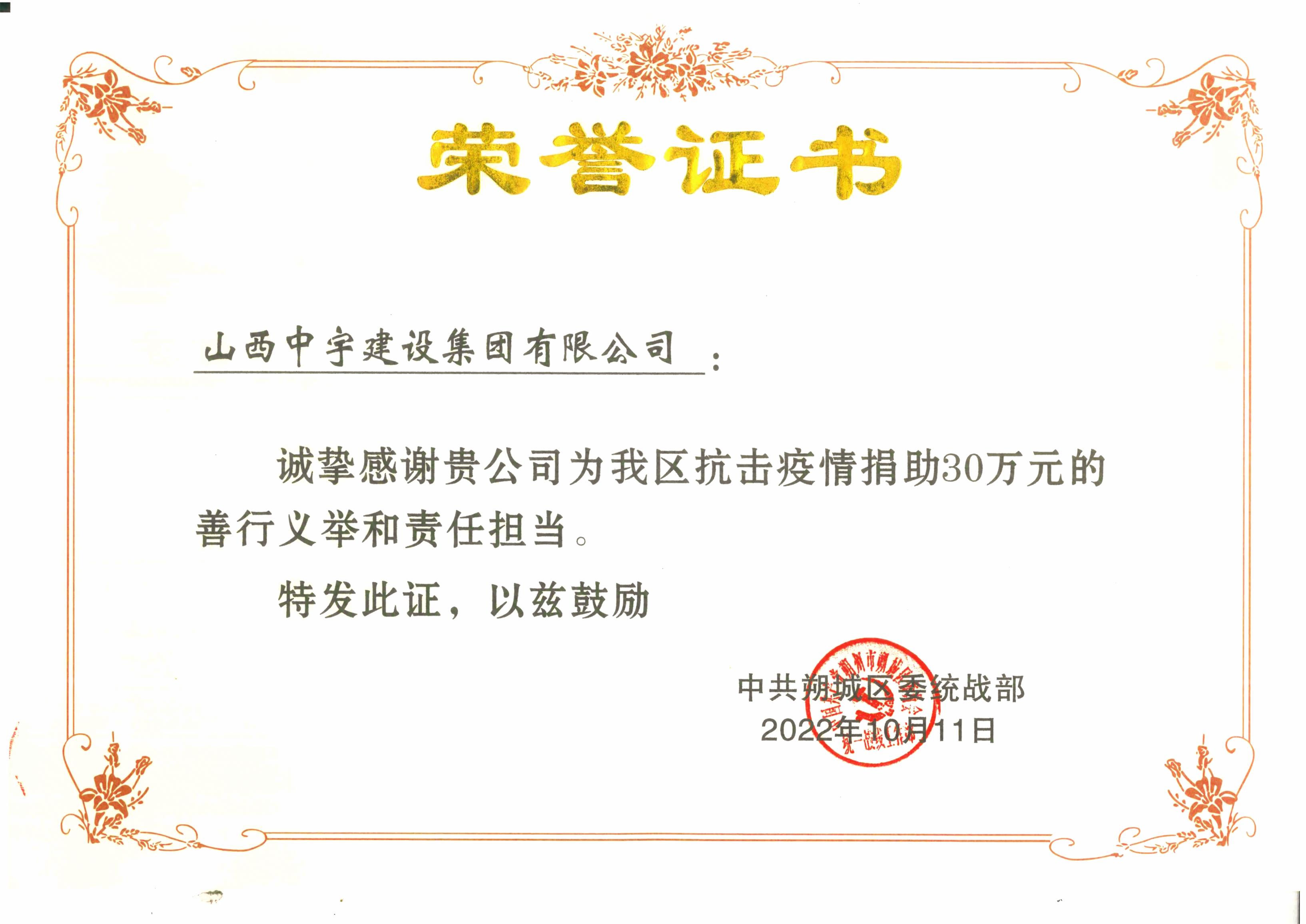 “至誠致信的服務(wù),讓用戶滿意”是中宇集團永恒的追求2022年捐助紅十字會30萬元榮譽證書